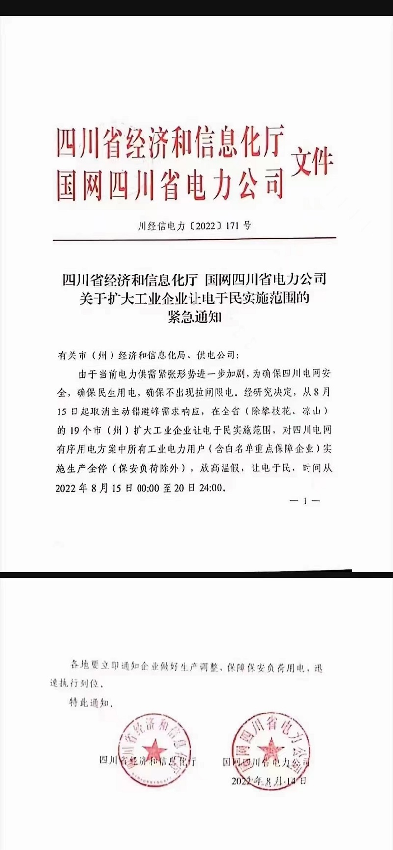 8月15日,四川再次召開電力保供調度會,全省(除攀枝花、涼山)的19個市(州)擴大工業企業讓電於民實施範圍,對四川電網有序用電方案中所有工業電力用戶(含白名單重點保障企業)實施生產全停(保安負荷除外)日。時間從2022年8月15日00:00至20日24:00。麵對突如其來的停產,搞得很多包裝廠家猝手不及!