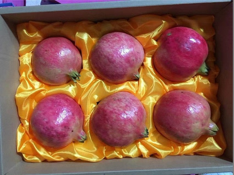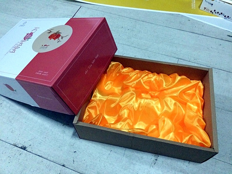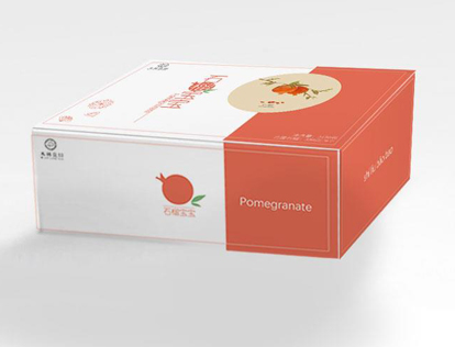 石榴包裝盒製作,石榴包裝製作br/>1、材質:300克灰紙裱E瓦楞;2、工藝:印刷、亮膜