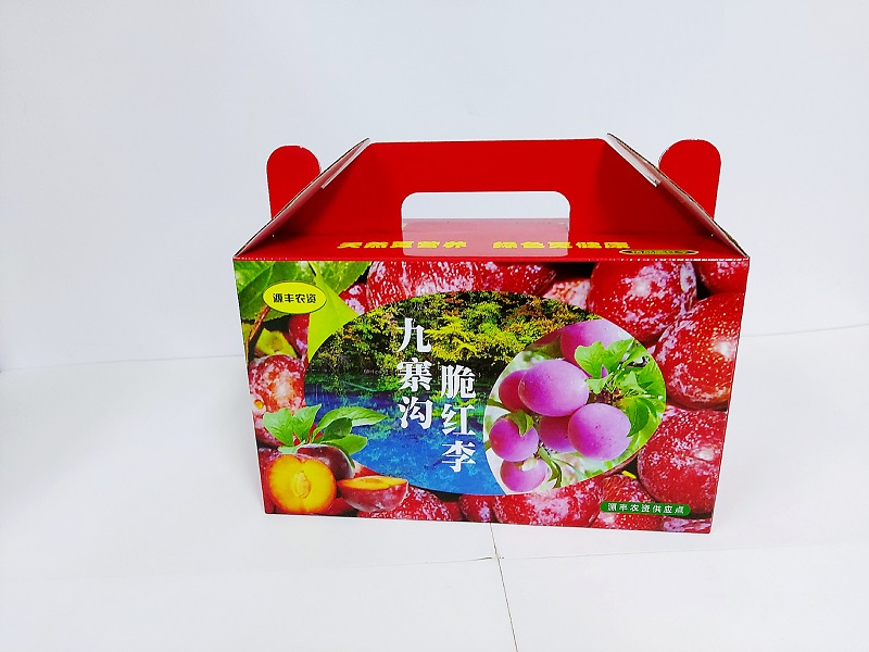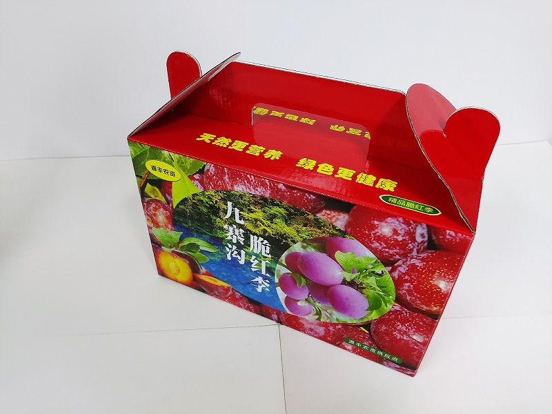 九寨溝脆紅李包裝盒定做1、材質:250克灰紙裱三層白E瓦楞;2、工藝:印刷、亮膜、裱瓦、模切、粘盒