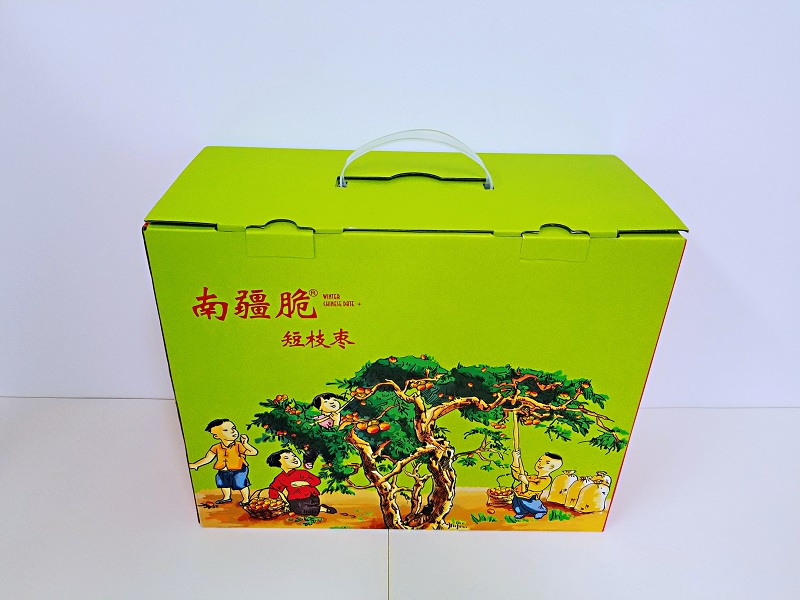 南疆脆棗禮品包裝盒製作采用平口開箱、手提結構設計給人以一種高端的效果,配合釋放天然、綠色的表麵設計、後期的紅字燙金讓整個棗子包裝盒具有吸睛的效果,不管是零售還是發放物流,都可以完美的與其他產品一起堆碼存放,那對產品的保護性能可以得到較大提升,減少產品損失,提高成本效益。