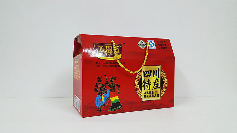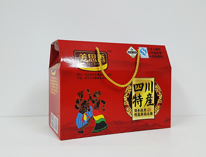 四川土特產(chan) 禮品盒1、材質:300克灰紙裱E瓦楞;2、工藝:印刷、亮膜